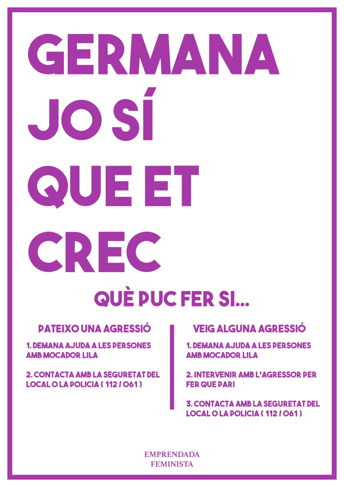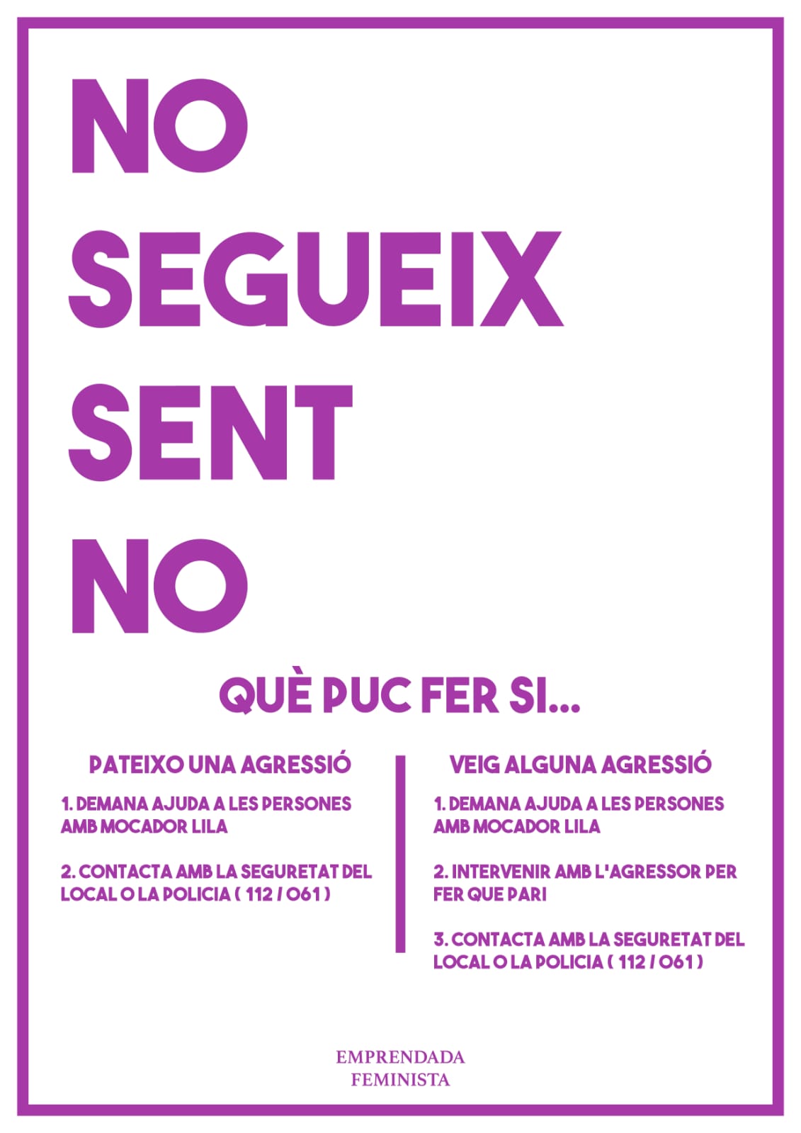 Por un lado, se pegarán carteles con tres mensajes principales (sobre una isla libre de volencia machista, sobre cómo actuar en caso de ver o sufrir una agresión sexual y otra para sensibilizar a los hombres) y, por otro lado, se dividirán en grupos para vigilar que no ocurra ninguna desgracia. Para ser más visibles llevarán un pañuelo de color lila en el brazo y pedirán la colaboración de los diferentes bares y discotecas.