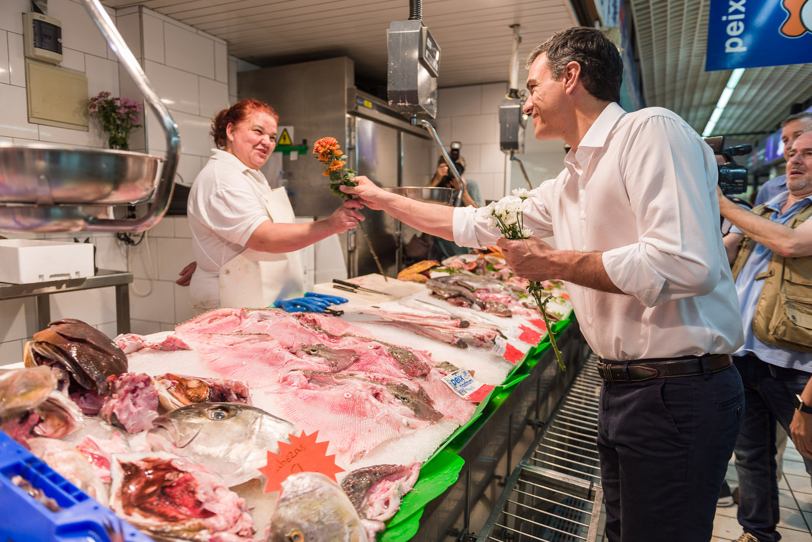 Antes del mitin en el Parque de la Paz, Pedro Sánchez recorrió el Mercat Nou regalando flores a clientes y vendedores. La expectación ante la presencia del líder socialista fue máxima: fotos, autógrafos y selfies fueron la tónica de la visita del candidato, con el que casi todos los presentes querían retratarse, trasladarle unas palabras o arrancarle un compromiso.