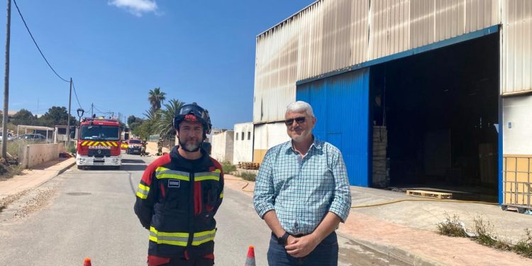 El conseller de Interior de Formentera, Josep Marí, y el jefe de Bomberos, Alex Valeiras, han hecho hoy balance del incendio que ayer afectó de manera dramática a una nave de alimentos en la zona industrial de la isla.