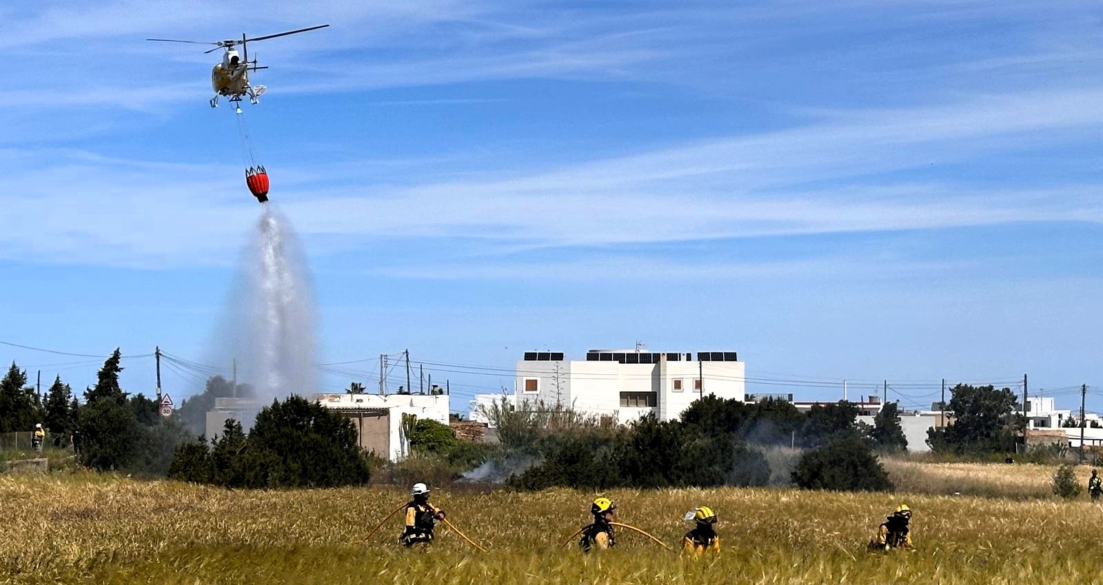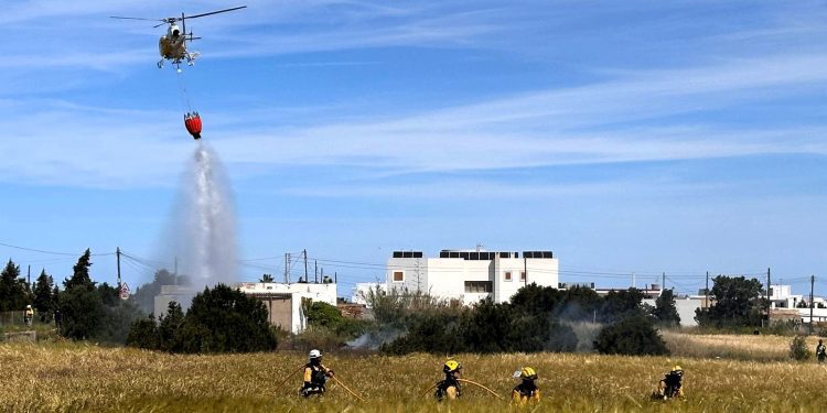 Mañana complicada para los servicios de emergencia en Ibiza. Medios terrestres y aéreos del Instituto Balear de la Naturaleza (Ibanat), junto con efectivos de los Bomberos de Ibiza, han tenido que intervenir de urgencia para sofocar un incendio agrícola declarado en el barrio de Cala de Bou, en el municipio de Sant Josep.