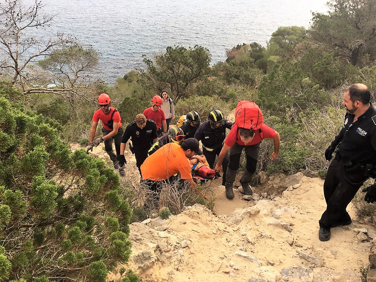 @Noudiari / Un mujer lesionada en un tobillo en sa Pedrera de Cala d’Hort ha tenido que ser rescatada este domingo en una intervención en la que han participado bomberos, Policía Local de Sant Josep, Guardia Civil y Protección Civil. Como consecuencia de las heridas producidas, la víctima ha tenido que ser trasladada en camilla hasta la cima del acantilado por las complicadas cuestas de arena que hay en esta escarpada zona del litoral del municipio de Sant Josep de sa Talaia.