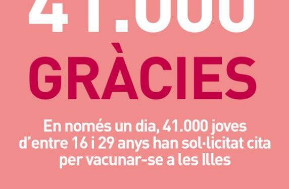 La respuesta de los jóvenes de Baleares a la vacunación ha sido un éxito, en un solo día 41.000 baleares de entre 16 y 29 años ha pedido cita para vacunarse contra el covid-19. «Una vez más, la respuesta de nuestra ciudadanía ha sido impecable. Gracias a todos los que ya tenéis cita y a los que la pediréis estos días en la Bitcita. Sois todo un ejemplo de compromiso y responsabilidad», indica el Govern.