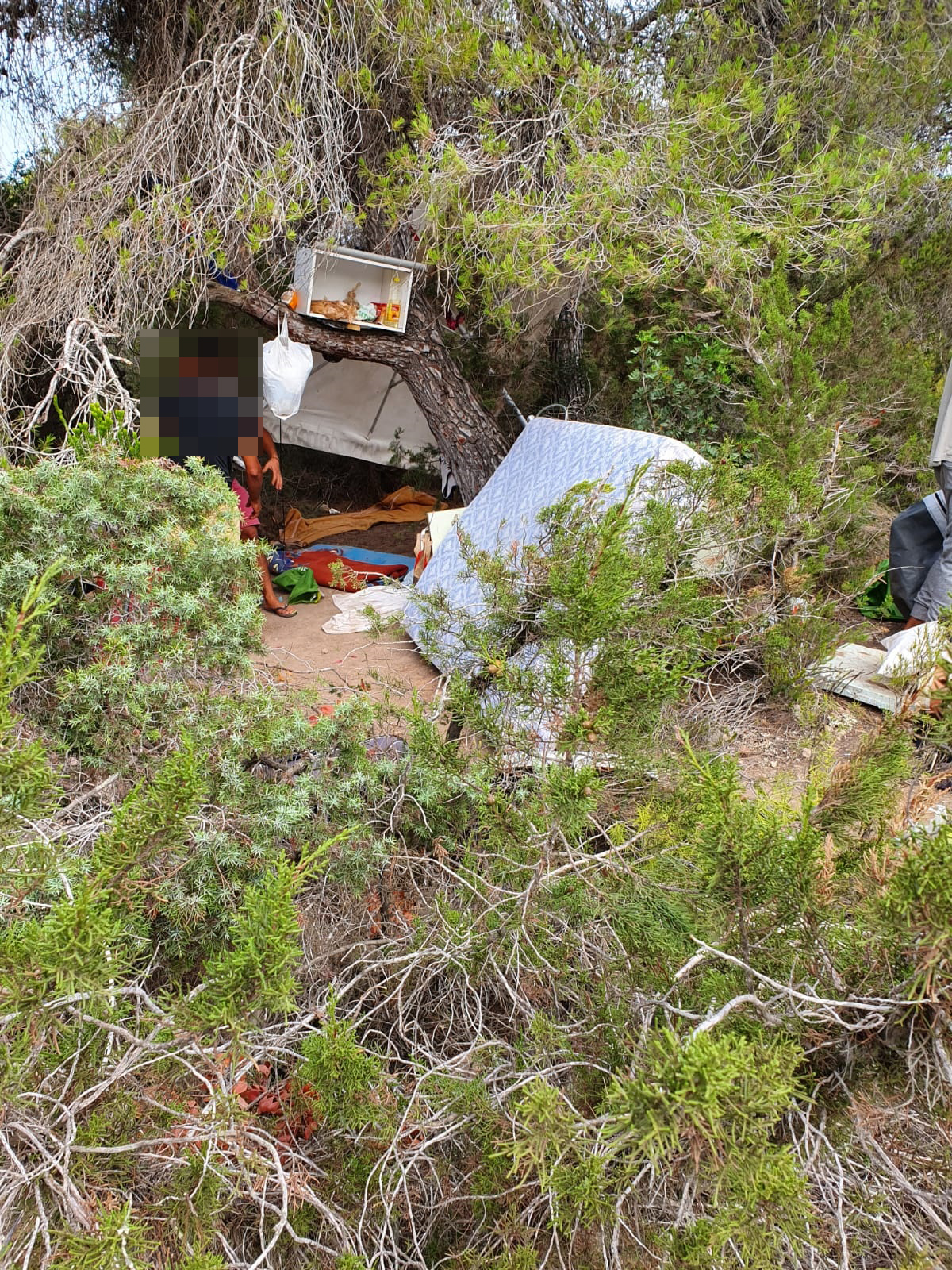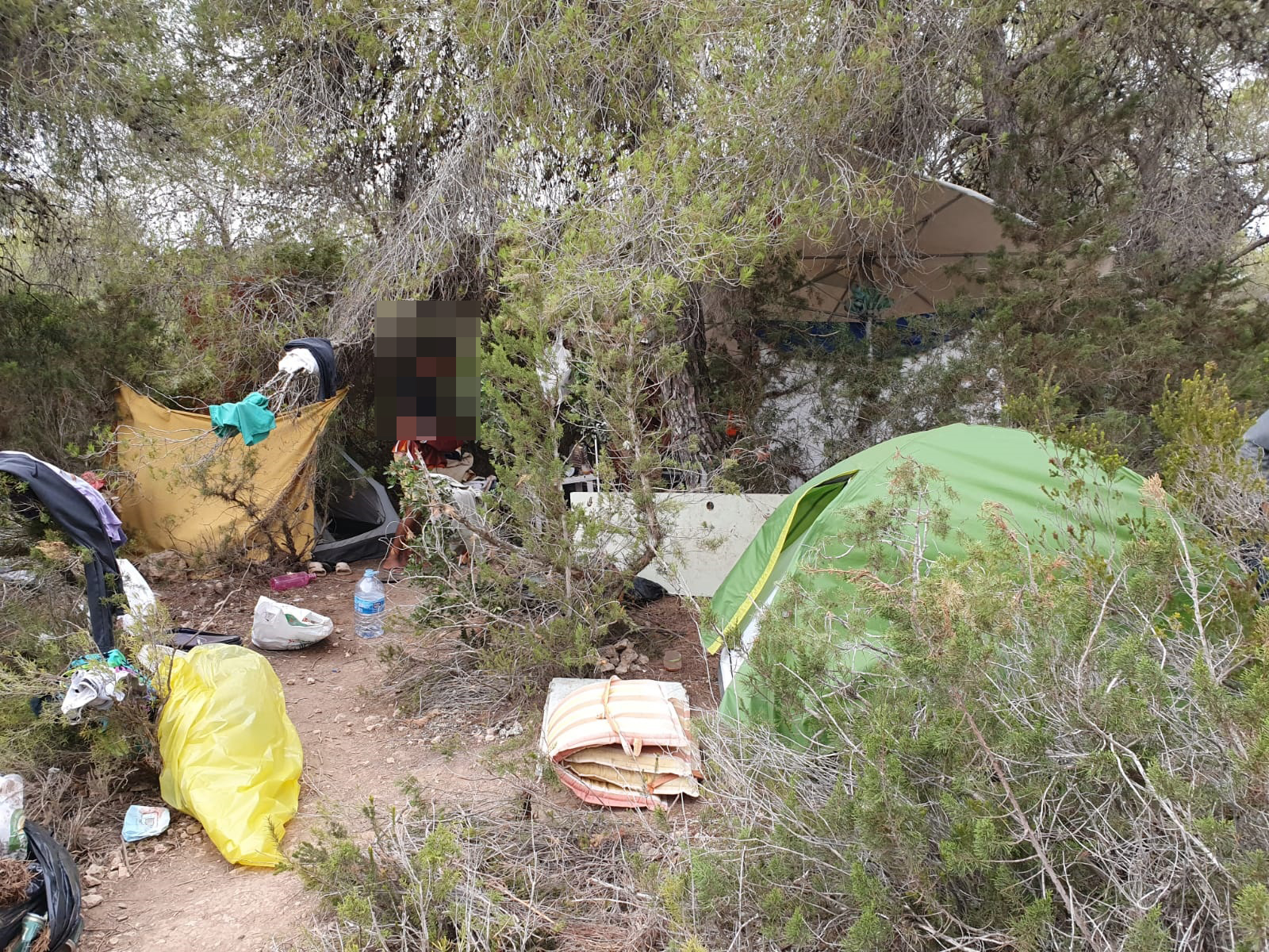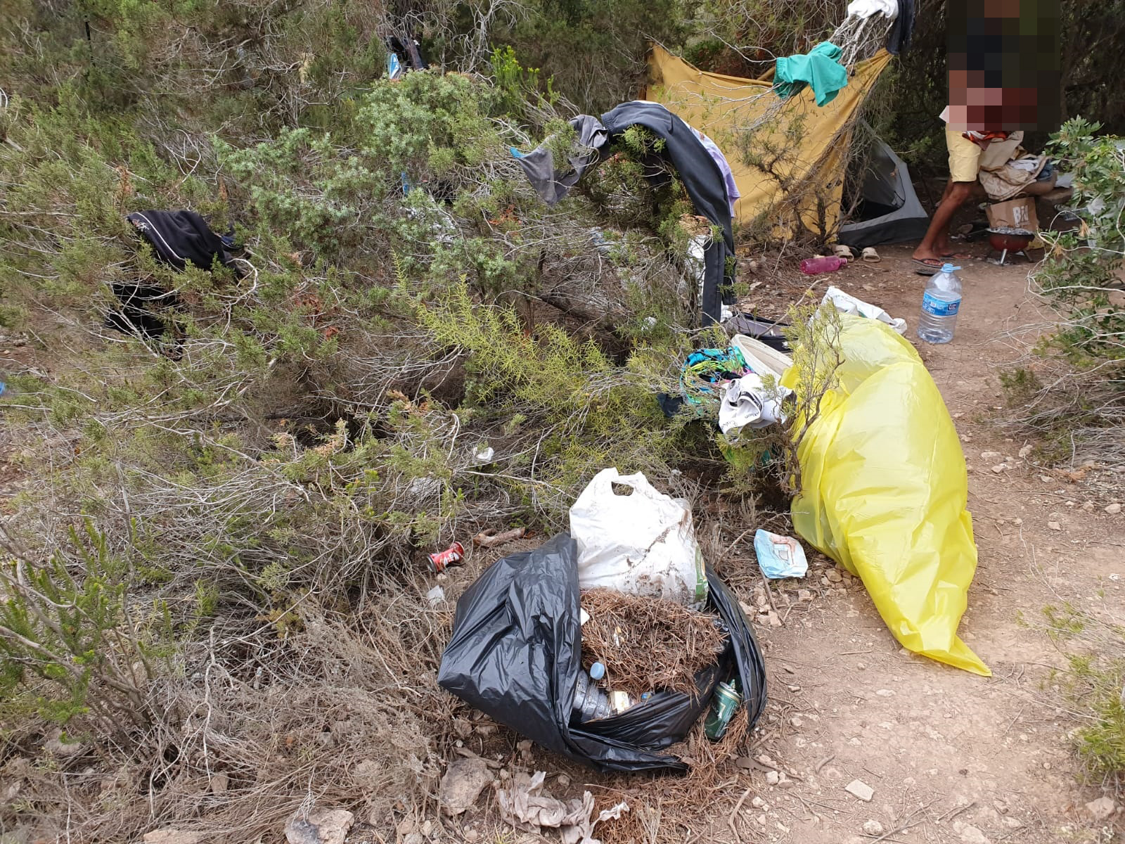 @Noudiari / Agentes de la Policía Local y operarios del servicio de limpieza y personal del departamento de Medio Ambiente del Ayuntamiento de Sant Antoni han desmantelado varias acampadas ilegales en la zona boscosa de la montaña de sa Talaia. En total, los agentes y los operarios municipales retiraron 600 kilos de basura y levantaron seis actas de denuncia por realizar acampadas ilegales.