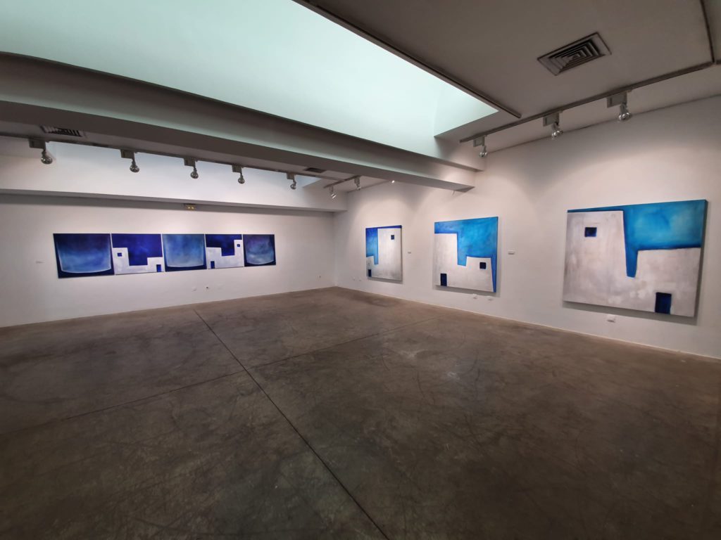 Això sí, sempre amb el nexe de la recerca d’allò que és essencial, eliminant tot element que pogués ser superflu. I encara que les textures planes i els blaus dominen l’exposició, l’artista ha volgut mostrar complicitat amb una sèrie d’obres anteriors, que destaquen per l’ús de tonalitats més càlides i a la vegada amb un tractament subtil de la matèria, rompent així, tal com manifesta l’autor «amb la força dels blaus que són la unió perfecta entre la mar, el cel i la terra».