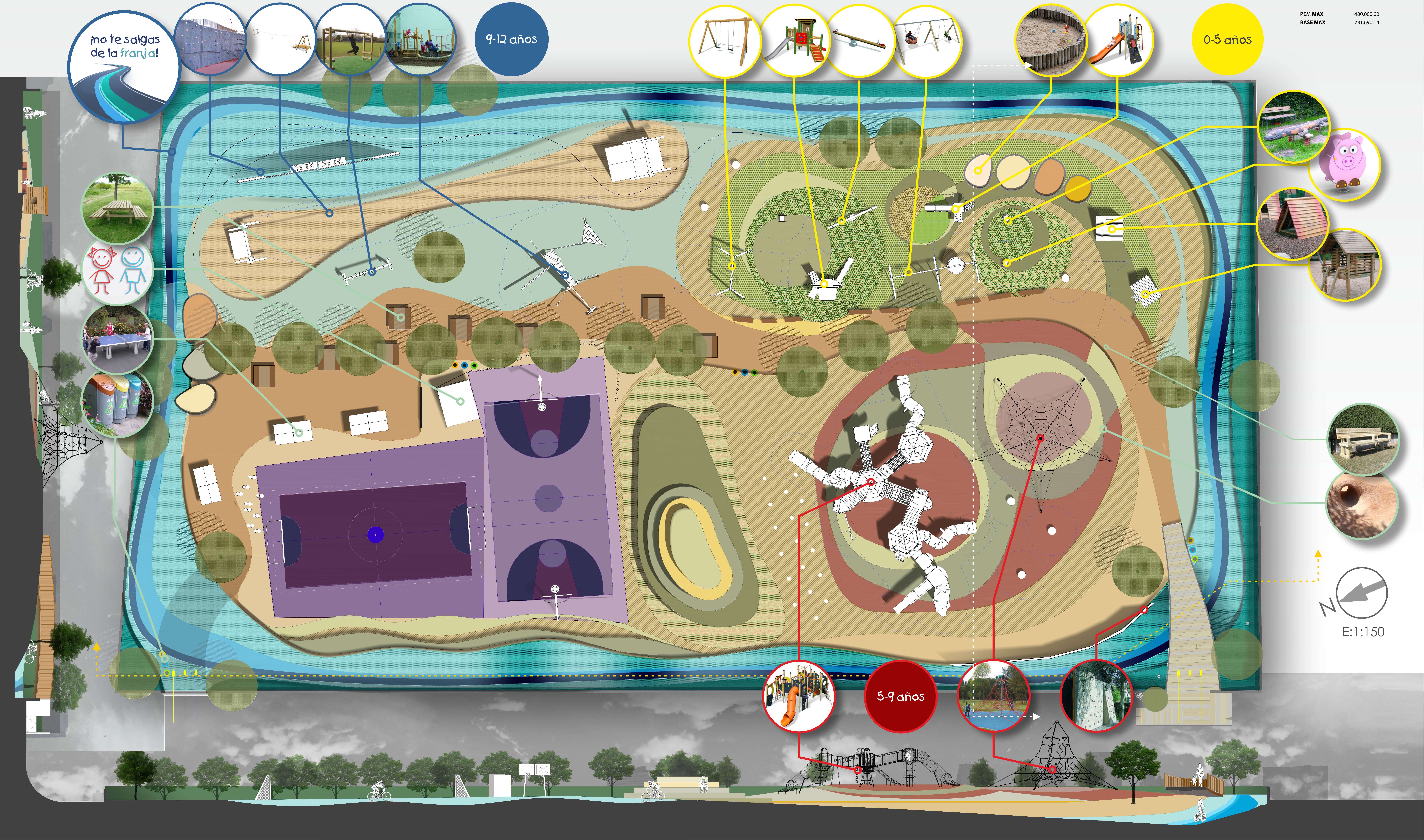 Se utilizará el color del pavimento como elemento identificativo para diferenciar los espacios por edades por lo que los equipamientos evolucionan desde los juegos más infantiles hasta los juegos de los más grandes. Por otra parte, al no estar separados físicamente por edades facilita, de manera natural, el juego entre niños de diferentes edades, ya que prima la habilidad motora.