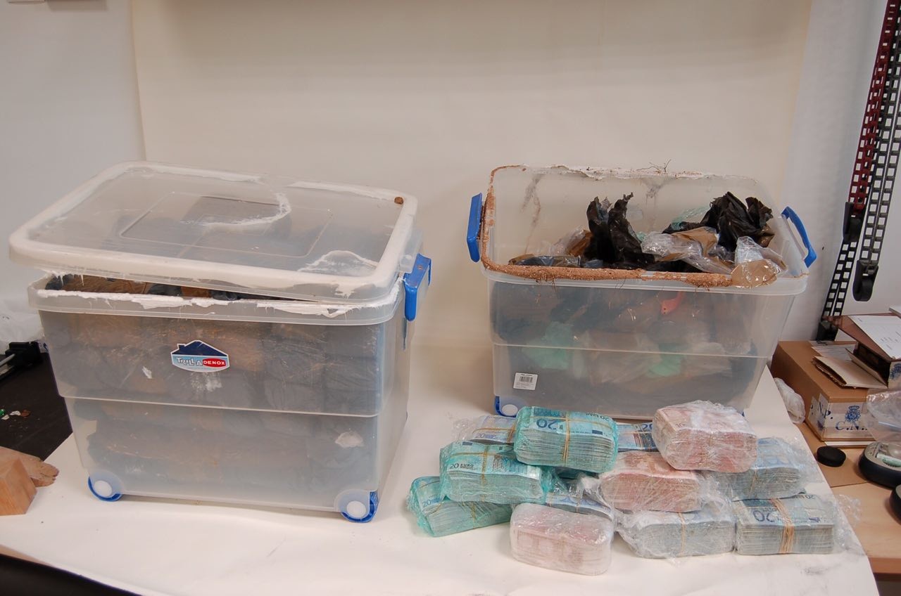 En las fotografías aportadas hay también dos cajas de plástico rellenadas de montones de billetes confiscados. «De la imagen se deduce que los fajos estaban cubiertos por un plástico negro parecido al material de las bolsas de basura y por cinta marrón. Llama la atención que en una de las cajas el contenido aparezca estrujado y la cubierta negra arrancada», añade El Temps.
