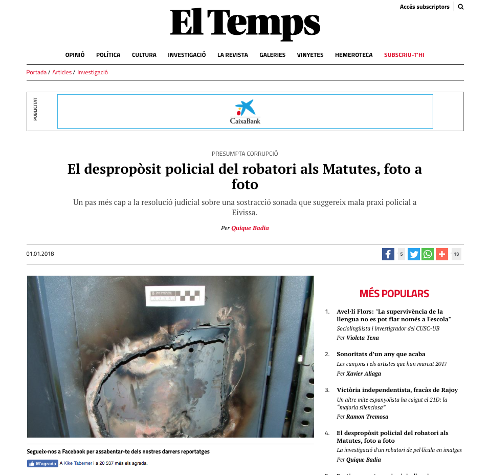 @Noudiari/El semanario El Temps ha publicado las fotografías de las pruebas del robo al Grupo Empresas Matutes perpetuado el 26 de octubre de 2013. Según la publicación, las imágenes se aportaron como pruebas cuatro años después del atraco por el que se ha arrestado e imputado a dos policías nacionales, uno acusado material del robo y otro de encubridor.