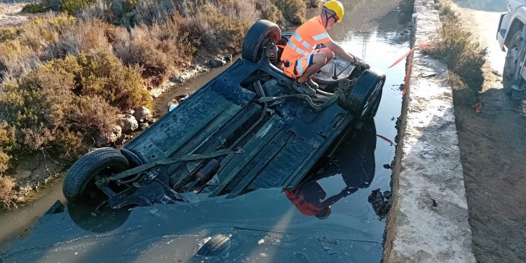 Un camionero de la empresa Brillant y un guardia civil fuera de servicio han salvado esta mañana la vida al conductor de un coche que, tras chocar y derrumbar un muro, ha volcado en el interior de uno de los canales de agua salada de ses Salines, en el camino que conduce a la playa de es Cavallet, en Ibiza.