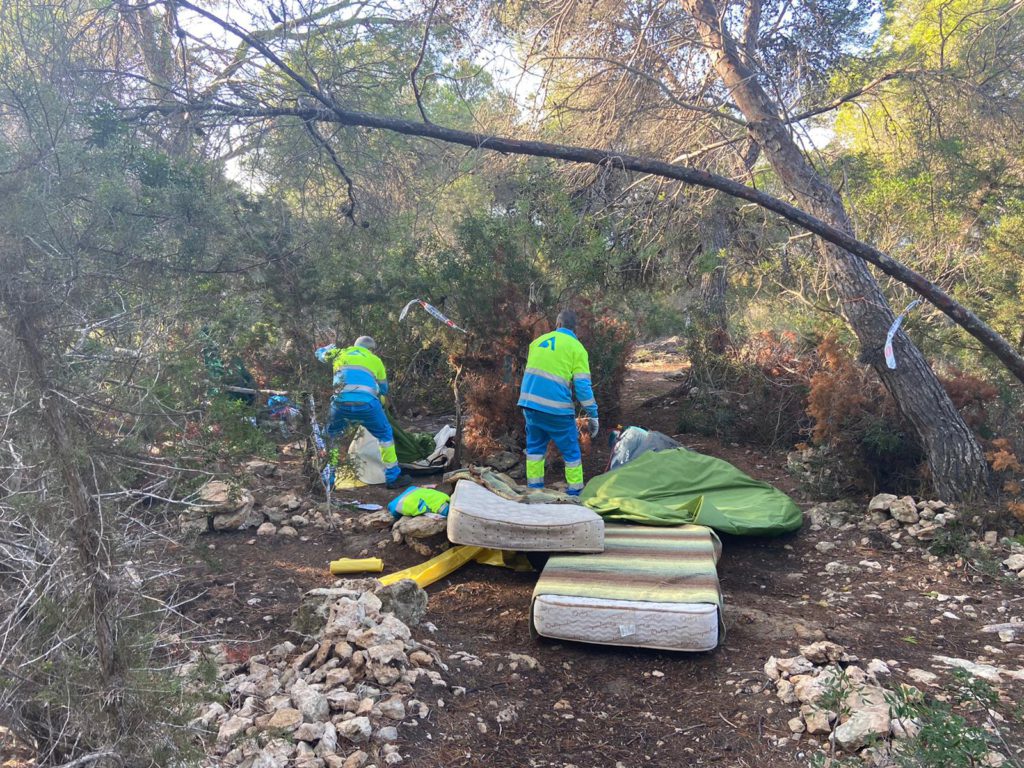 NouDiari / La Policía Local de Sant Antoni, junto al departamento de Medio Ambiente del Ayuntamiento de Sant Antoni y agentes adscritos a la Unidad de Medio Ambiente (UMA) del cuerpo policial, han procedido este fin de semana al desmantelamiento de un asentamiento ilegal situado en sa Talaia.