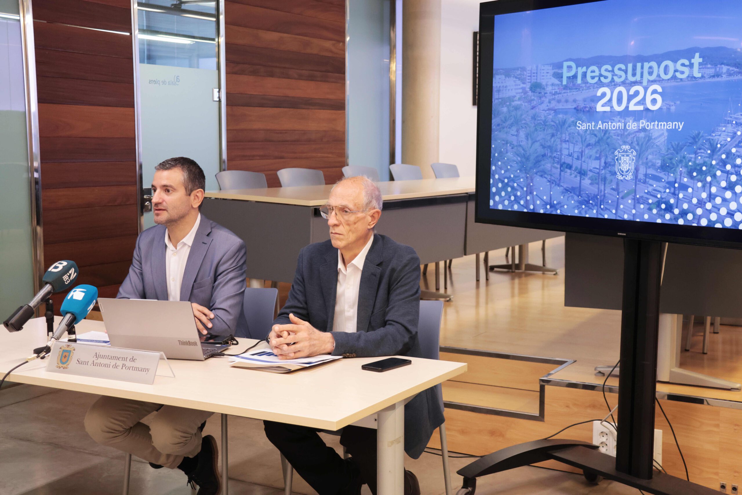 El alcalde de Sant Antoni de Portmany, Marcos Serra, y el concejal de Economía y Hacienda, Antoni Marí, han presentado esta mañana el presupuesto municipal para 2026, que asciende a 56.138.666 euros, un 10,66 % más que en el ejercicio anterior.