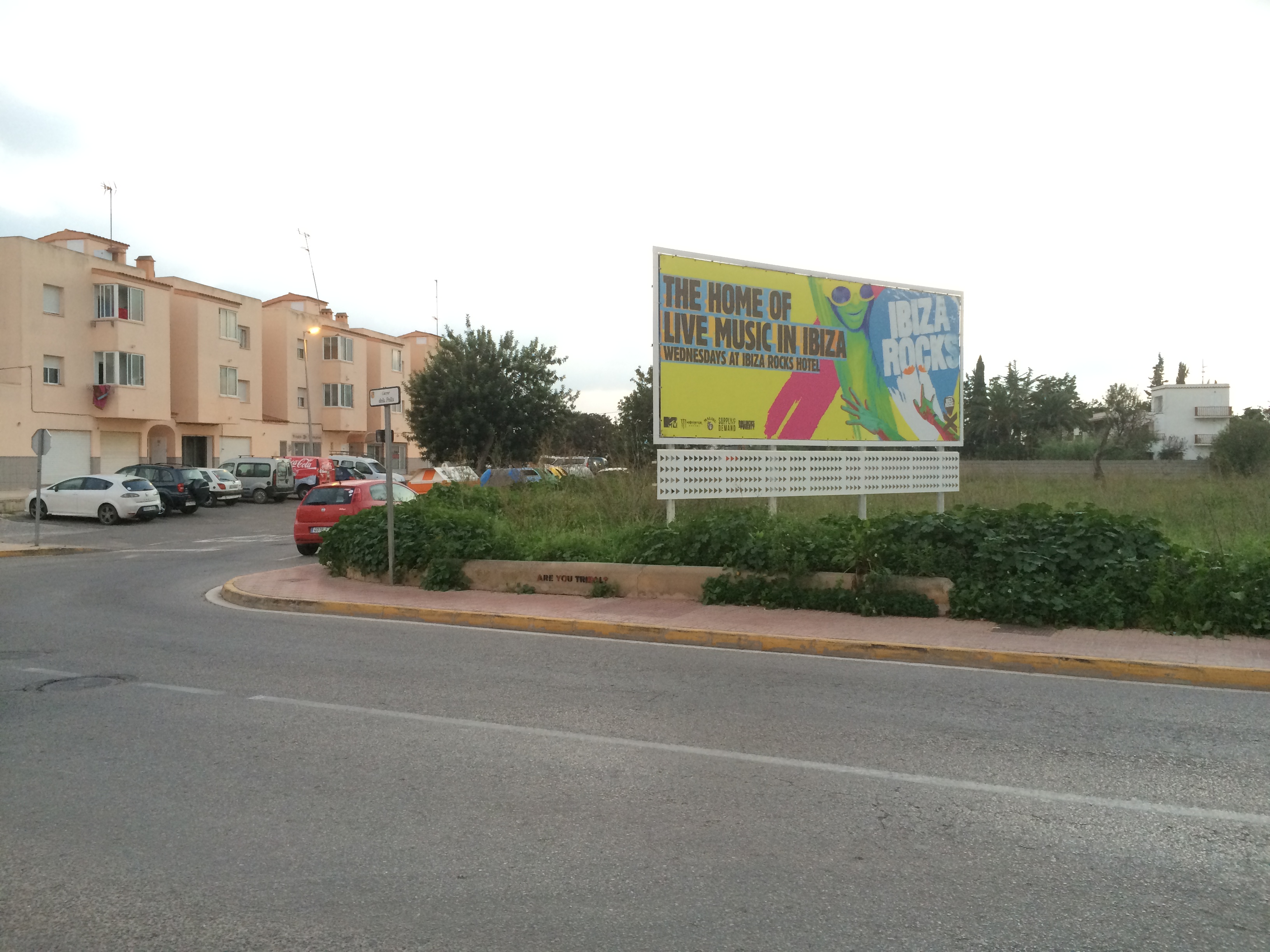 Valla publicitaria en un cruce de Platja d’en Bossa, en el lindero de una parcela, cuando debe estar a un mínimo de diez metros, según la normativa.