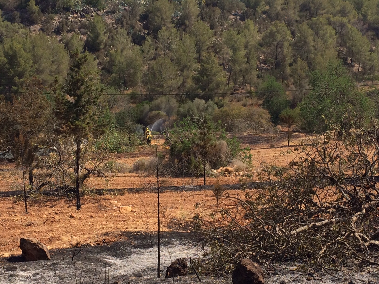 @B.R./ Los servicios de emergencias ya dan por controlado el incendio de Sant Miquel y cifran la superficie quemada en 30 hectáreas aproximadamente. A estas horas, agentes del Ibanat y bomberos del Parc Insular de Bomberos se encuentran en la zona refrescando el lugar.