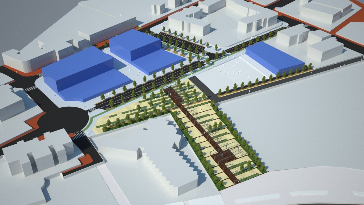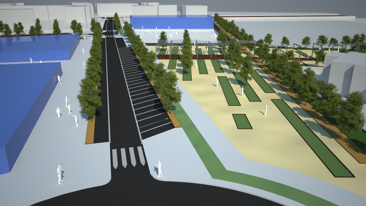 Plazas de aparcamiento y paseo ajardinado