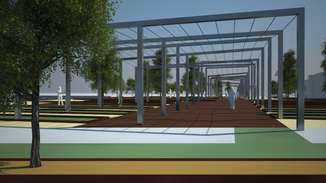 La actuación prevé también la creación de un gran paseo ajardinado hecho con materiales naturales y reciclables que empleará un sistema de terrazas o bancales para superar el desnivel existente entre el Paseo Marítimo y la ampliación de la calle Sant Joan. Este paseo constará de una zona de paso central, definida por una pasarela de madera y con una pérgola continúa con plantas trepadoras mediterráneas para conseguir un techo vegetal y un espacio de sombra que haga más placentero el paso.