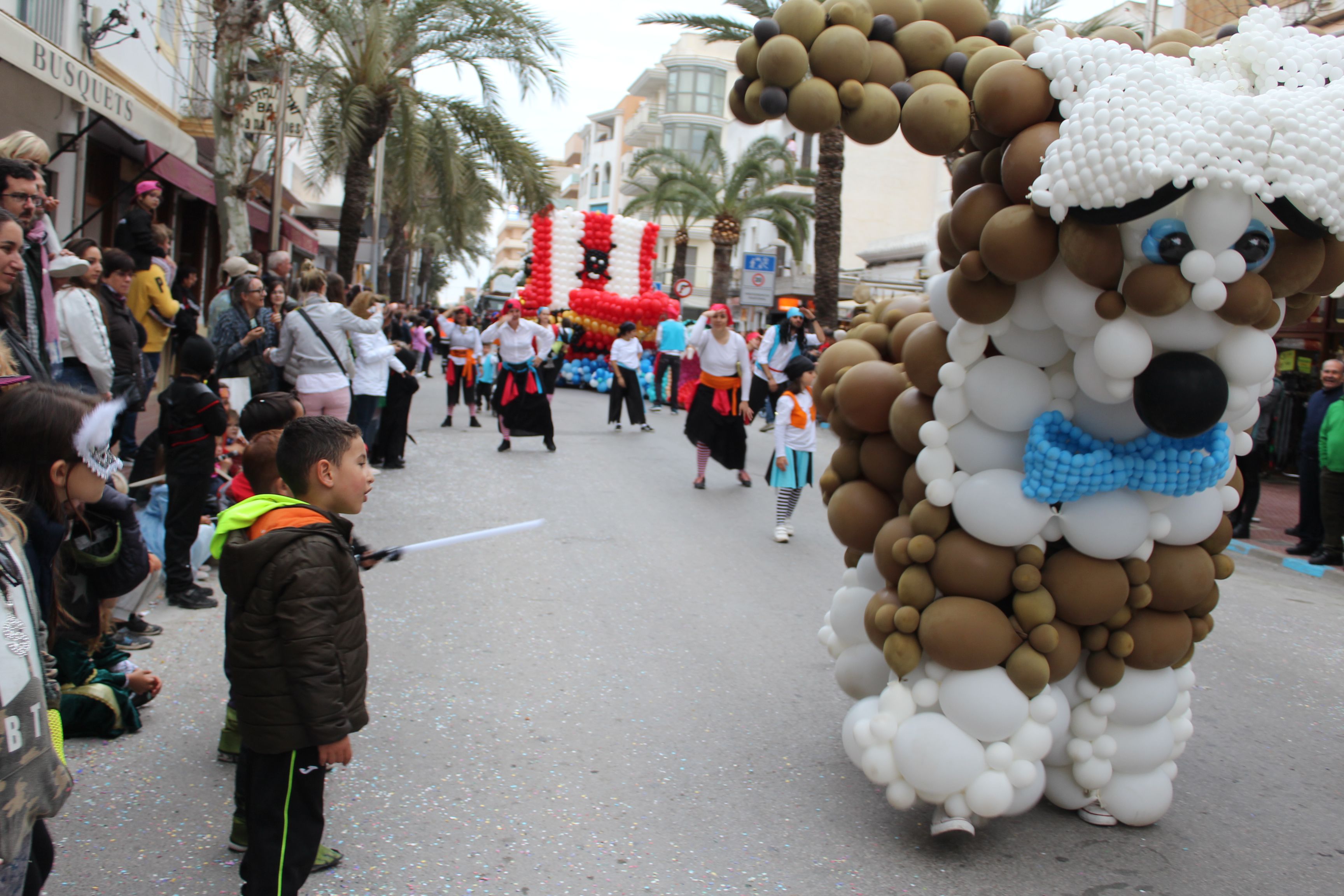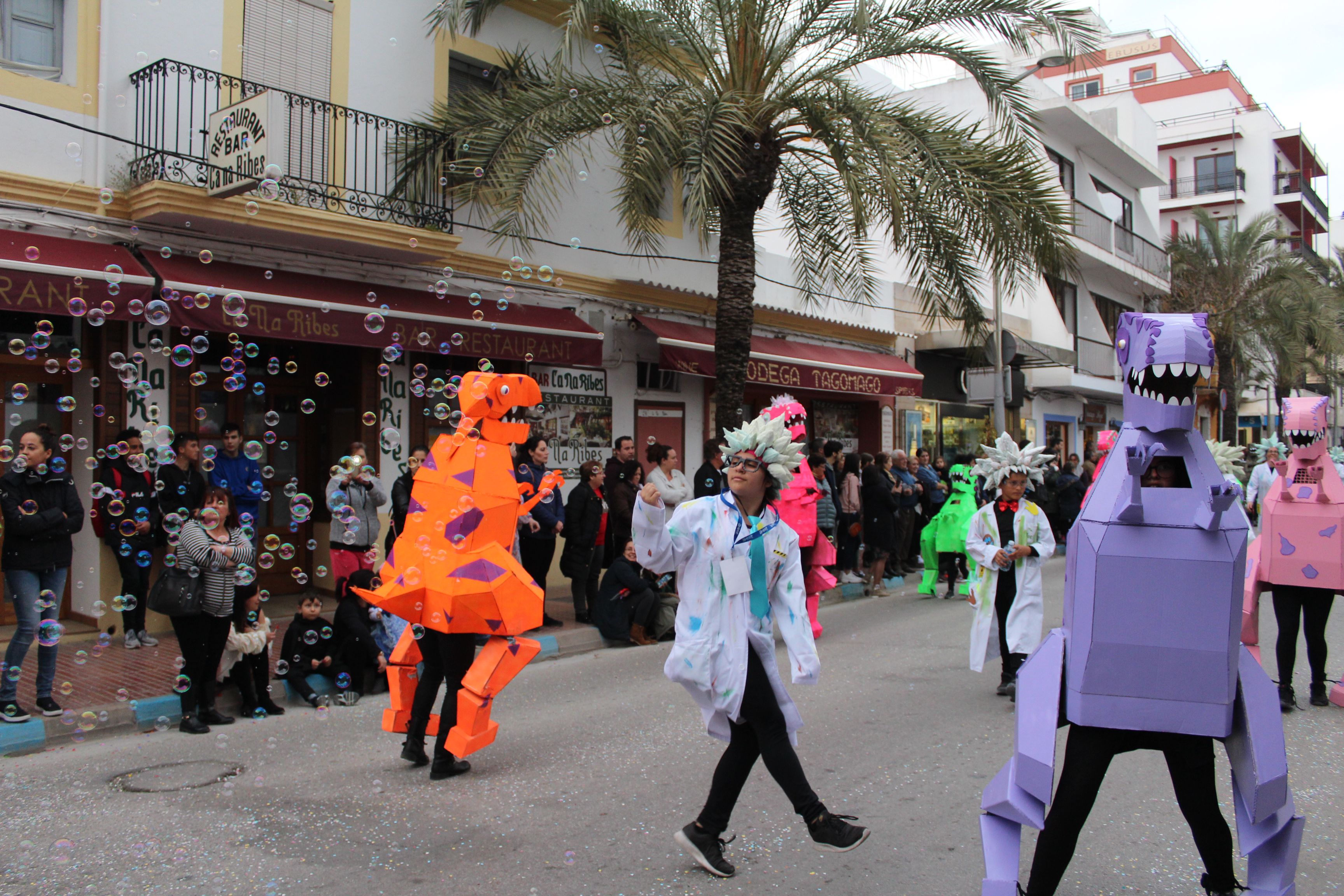 A la explosión de música y baile le acompañaba el color en los disfraces, algunos eran auténticas obras de la ingeniería de las manualidades como los Reciclasaurios del AMIPA S’Olivera que ha ganado en la categoría de comparsas escolares.