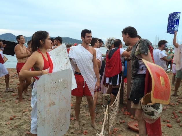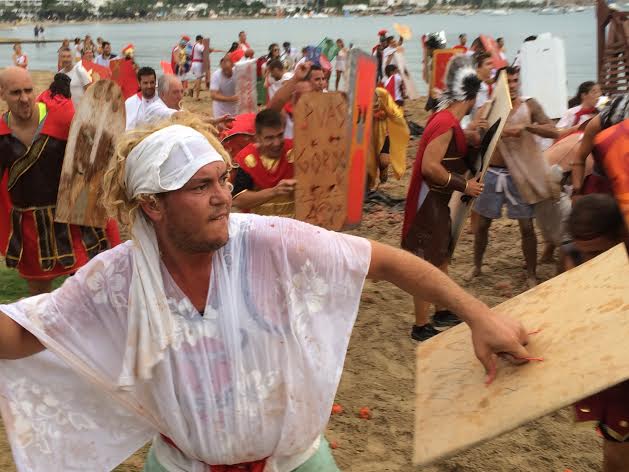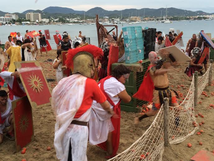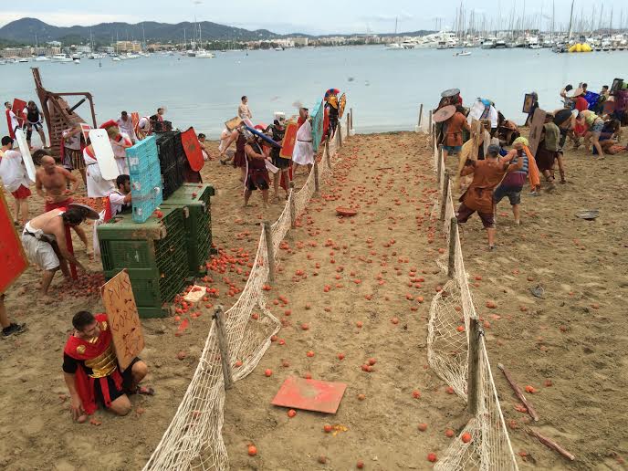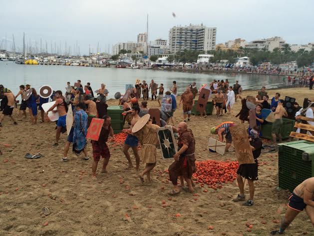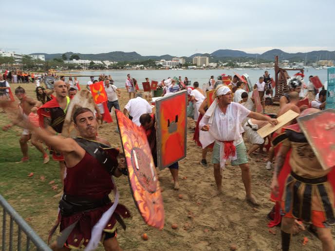 @Noudiari / Romanos y cartagineses han solventado este sábado sus diferencias sobre la arena de s’Arenal de Sant Antoni a tomatazo limpio, donde han rememorado un año más las Guerras Púnicas, o Romanas (depende del lado al que se estuviese), que hubo en su tiempo entre las que fueron las dos principales potencias del Mediterráneo durante los años 264 y 146 a.C.