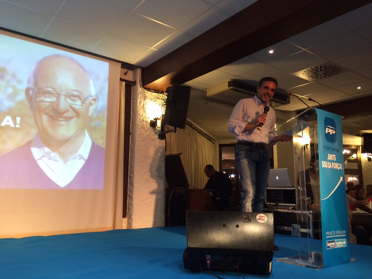 El cabeza de lista al Parlament balear, José Vicente Marí Bosó, que saltó al escenario con la música de It’s raining men (Están lloviendo hombres), hizo un alegato de la buena gestión realizada por el Govern balear durante estos cuatro años, la recuperación económica que han logrado y el aumento de numerosos puestos de trabajo, según explicó. También aplaudió la apertura del nuevo hospital de Can Misses, la licitación de la radioterapia [a pesar de que aún no está en funcionamiento] o la apertura de la residencia de Sant Antoni años después de haberse construido, entre otras cosas.