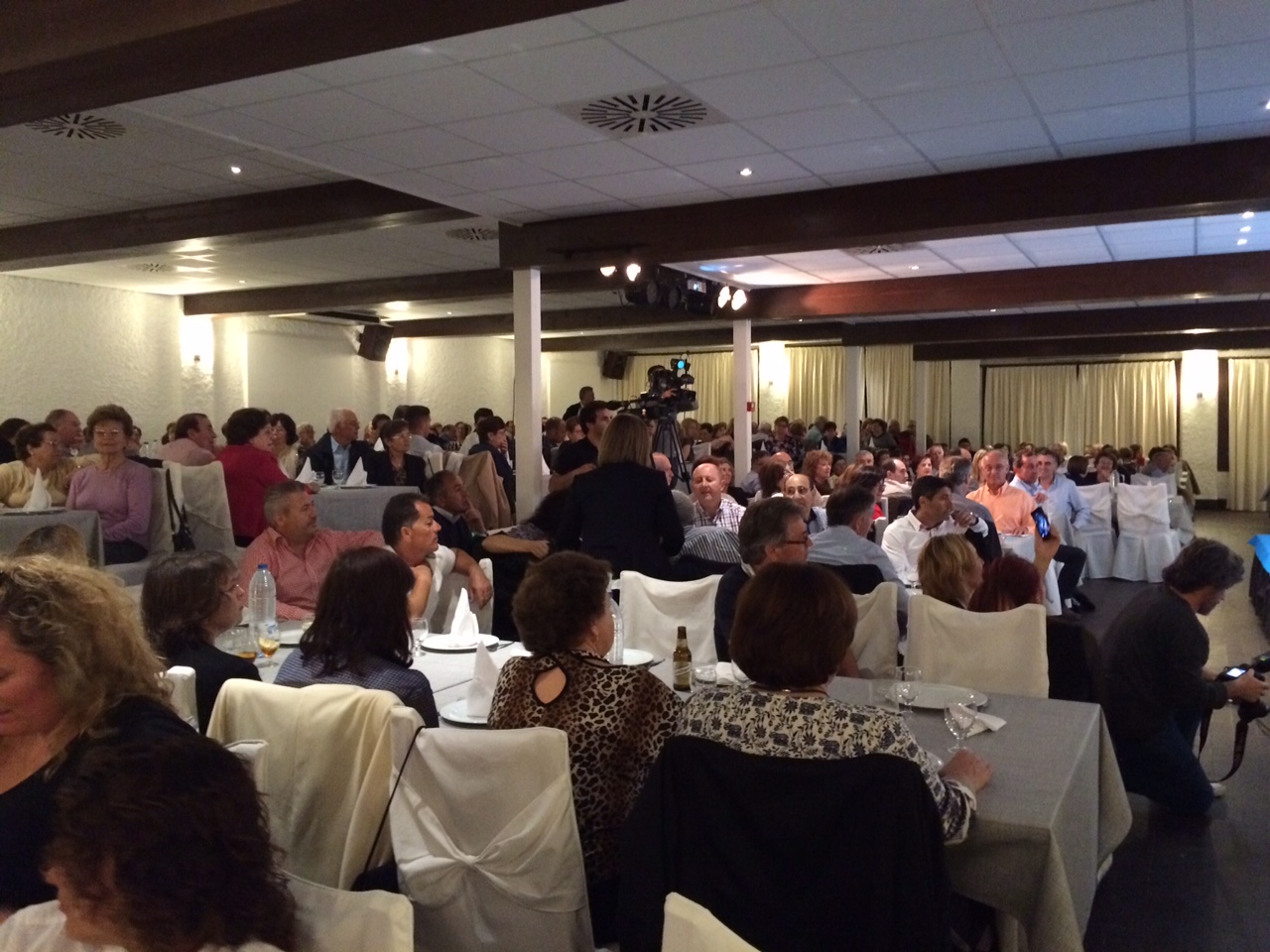 Pasadas las diez de la noche y con el aforo superado [en la entrada hay una placa donde se advierte que el aforo es para algo más de 600 personas mientras que el partido señaló que había sillas para 800], los cocineros se afanaban a preparar las ensaladas y el arroz de matanzas para los comensales que llevaban desde antes de las nueve de la noche aposentados en sus mesas engalanadas para asistir a la gran celebración y esta vez no era una comunión. Era la presentación de Pepe Sala. Por cierto de la canción pegadiza del PP, nada.