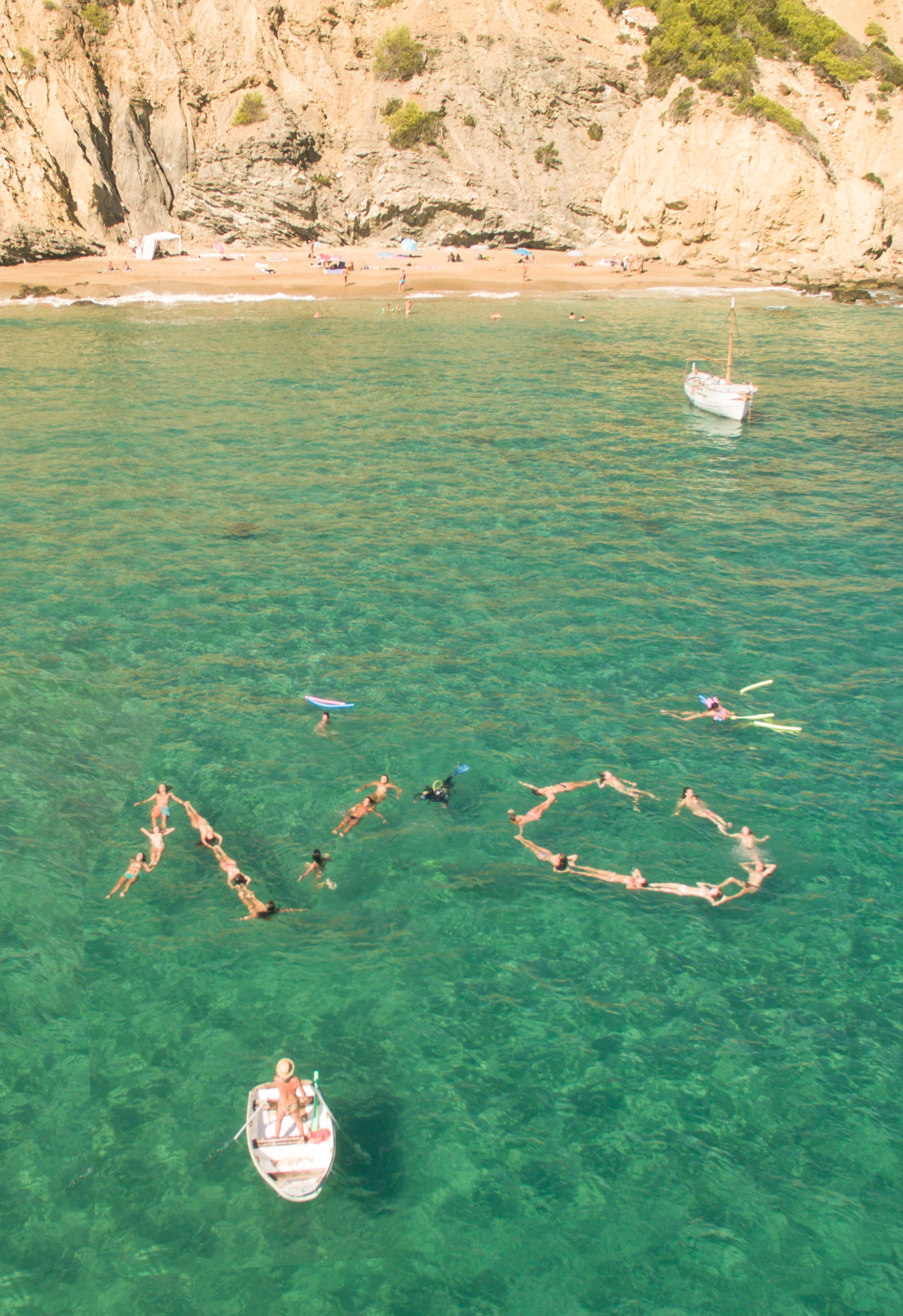 Una vista aérea de la perfomance realizada esta mañana en la playa de Aigües Blanques.