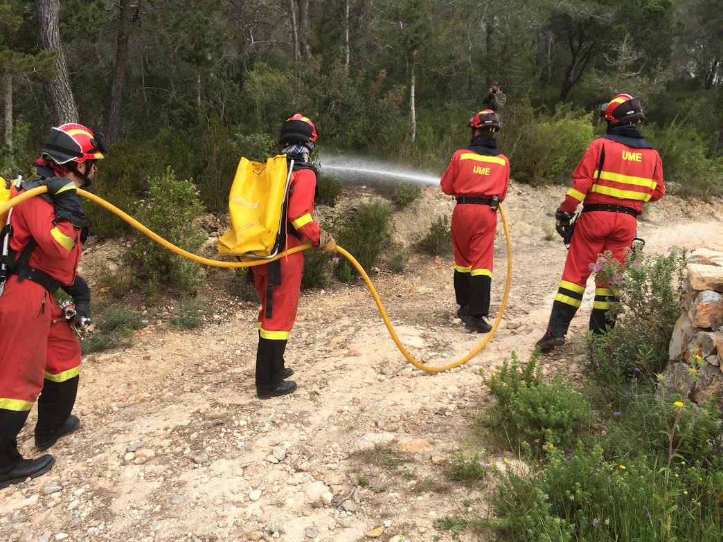 @L.Aversa/ La Unidad Militar de Emergencias (UME) se ha desplazado hoy a Ibiza para llevar a cabo un simulacro de incendio en cuyo ejercicio se incluía el hipotético desalojo de una fiesta para 200 personas en una casa de campo. El escenario del simulacro fue la montaña de Can Pere Mosson en Sant Llorenç.