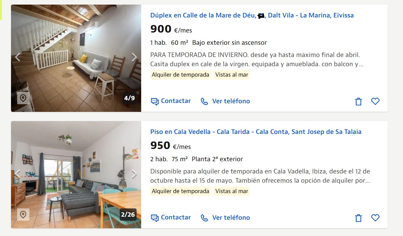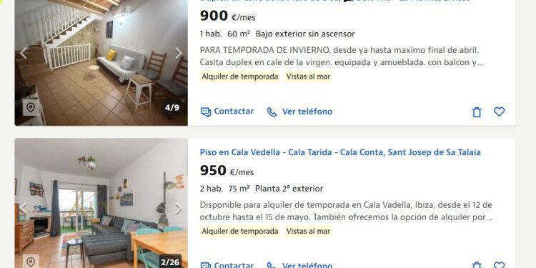 Por menos de 1.100 euros al mes, despídanse. La vivienda más barata es la de un estudio de Sant Vicent de sa Cala por 700 euros al mes, eso sí, “alquiler hasta final de abril”. La segunda referencia es la de un piso de dos habitaciones en Cala Llonga por 775 euros al mes, aquí también hay que desalojar la vivienda en verano, aunque podemos permanecer en ella durante diez meses, del 1 de septiembre hasta el 30 de julio.