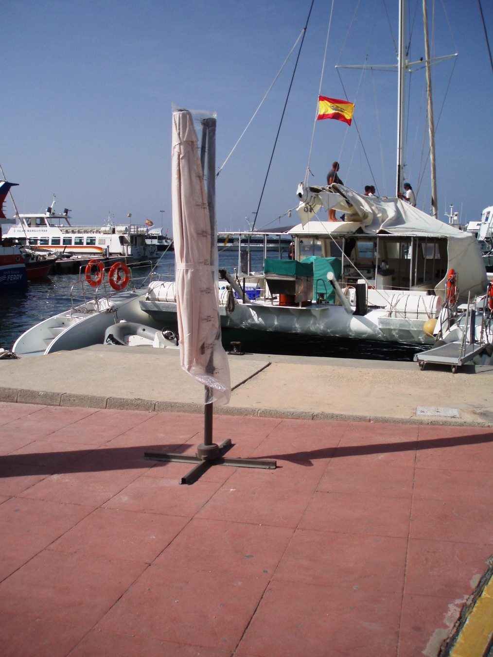Las cinco sombrillas que se han colocado en el muelle y enfrente de la Estación Marítima tienen un uso justificado y son para los policías portuarios, que tienen que hacer guardia, durante varias horas y bajo un sol de justicia. Por el contrario, los turistas tienen que sudar la gota gorda mientras esperan la hora de embarque.