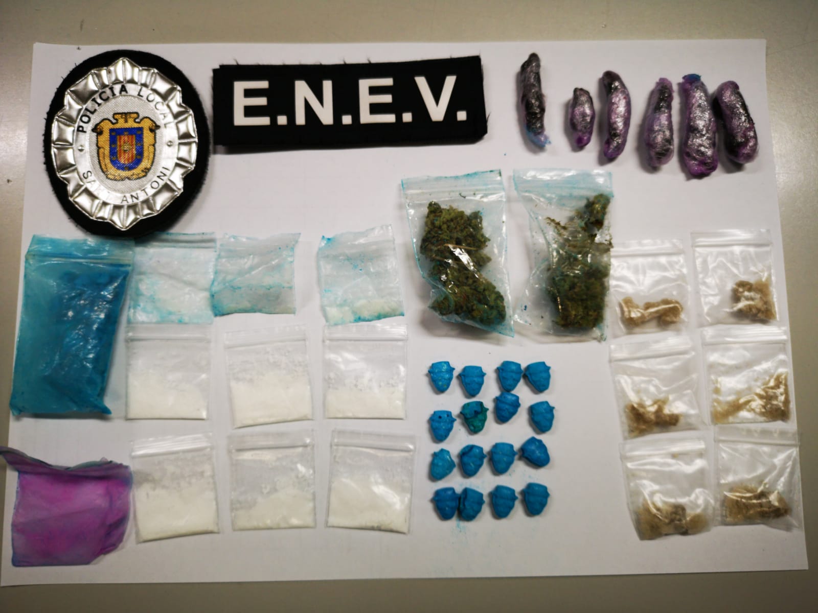 Al arrestado por un presunto delito contra la salud pública, los agentes le han requisado seis láminas de hachís, 16 pastillas de éxtasis, una bolsa con cocaína, seis con cristal y otra bolsa con 6,18 gramos de éxtasis, ha informado el Ayuntamiento de Sant Antoni en un nota.