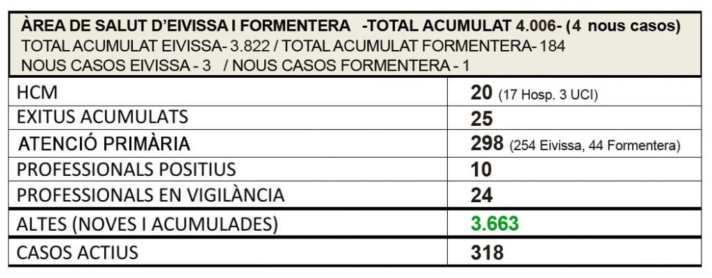 Por otra parte, un total de 298 personas reciben seguimiento domiciliario por su estado leve o asintomático, 254 en Ibiza y 44 en Formentera, de las que 28 corresponden al brote detectado en la menor de las pitiusas hace cinco días, cifra que se ha mantenido estable respecto a los datos ofrecidos ayer.