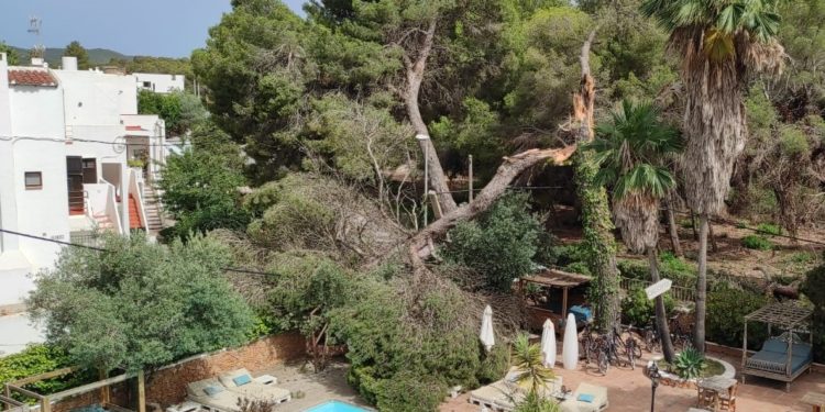 Un pino de grandes dimensiones se ha desplomado hoy junto a la piscina de un establecimiento hotelero de Santa Eulària sin que haya causado daños personales. El árbol se ha partido por la mitad y su caída ha sido ralentizada por un tendido eléctrico que ha acabado por arrancar. Efectivos del Parque de Bomberos de Ibiza se han encargado de retirar el pino, en una actuación que se ha prolongado por espacio de varias horas y en la que ha sido necesaria también la intervención de personal de Endesa de Ibiza.