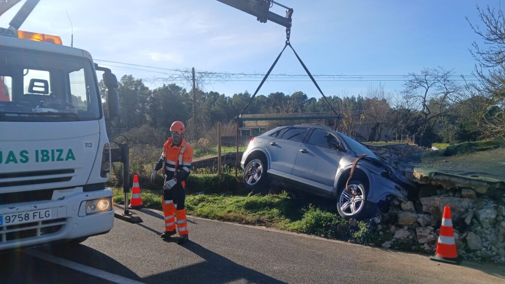 Hasta el lugar se desplazaron efectivos de Grúas Ibiza, que tuvieron que emplearse a fondo para extraer el vehículo de entre las ruinas, así como agentes de la Guardia Civil de Tráfico, que regularon la circulación durante las labores de retirada y aseguramiento de la zona.