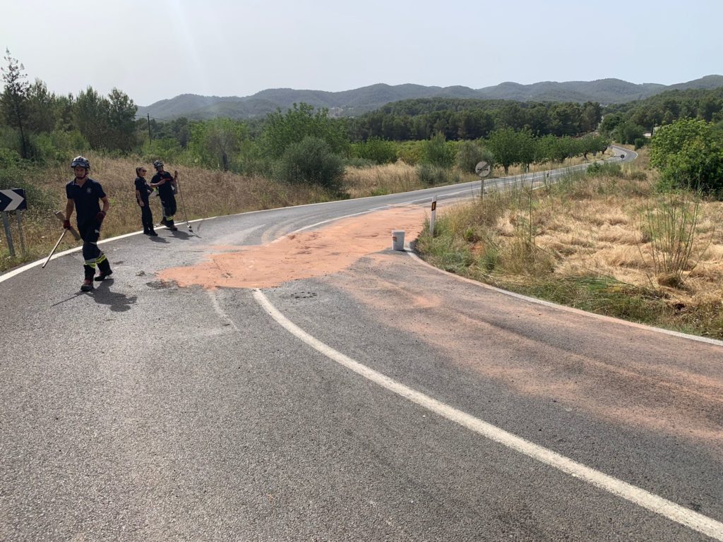 Los bomberos se han desplazado hasta el lugar exacto, aproximadamente un kilómetro antes de llegar al bar Can Tixedó , para limpiar la zona con sepiolita, ya que el camión había perdido gasoil. Este suceso ha ocurrido sobre las 16.20 horas, y el vehículo ha estado obstaculizando el paso en los dos sentidos de la vía, por lo que agentes de la Guardia Civil de Ibiza se han encargado de regular la circulación mientras se retiraba el camión y se limpiaba la vía.