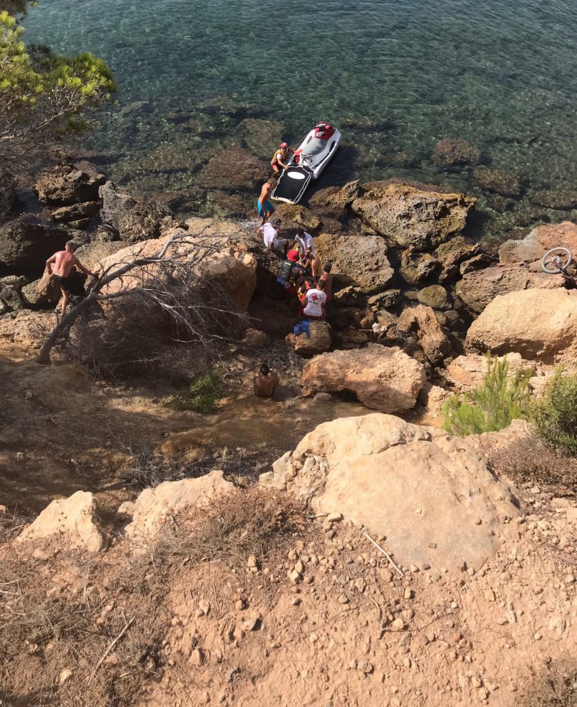Dado lo escarpado del terreno, una zona de grandes rocas a nivel del mar y con desniveles verticales de unos ocho metros, se decidió optar por usar una camilla rígida anfibia para la inmovilización del hombre y su traslado con moto acuática hasta s’Estanyol/es Niu Blau, un punto de más fácil acceso para la ambulancia del 061.