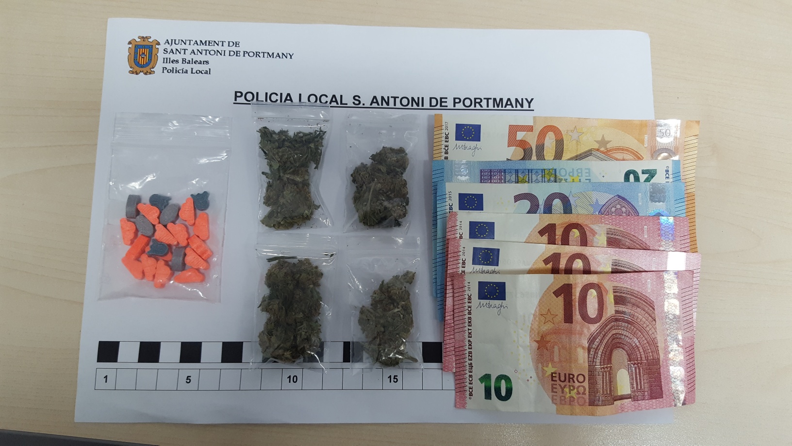 @Noudiari / Esta última madrugada, durante un dispositivo contra la venta ambulante y de substancias estupefacientes, la Policía Local de Sant Antoni de Portmany ha detenido a un individuo por un delito contra la salud pública. Se han incautado, además, 21 pastillas presuntamente de éxtasis y 4 bolsas de marihuana, además de 120 euros en efectivo.