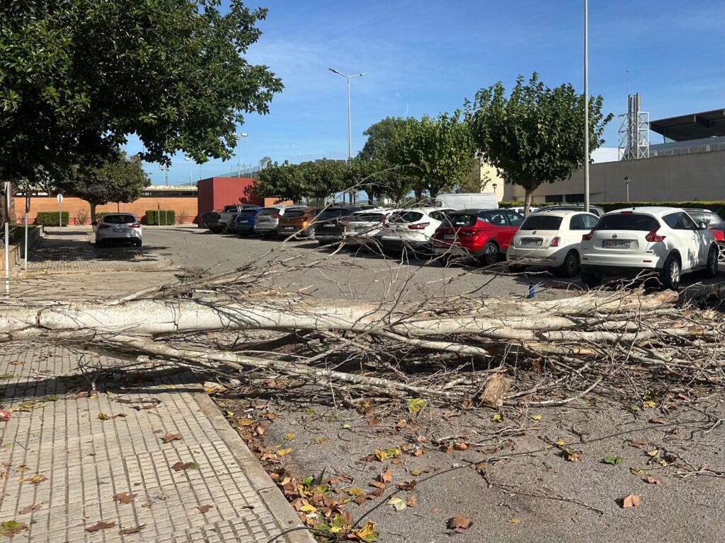 El árbol, junto al Polideportivo Sa Blanca Dona y las instalaciones de Es Raspallar, ha caído hacia la zona de aparcamiento pero, afortunadamente no ha habido que lamentar daños personales. Fotos Noudiari.es