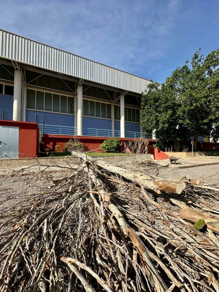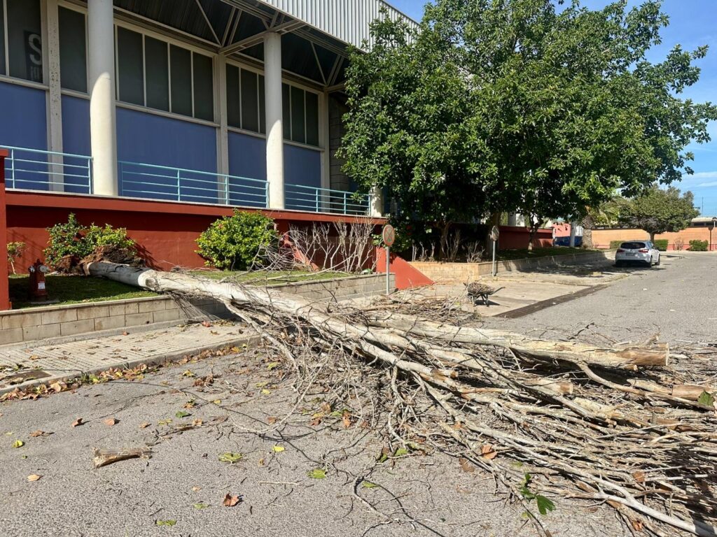 Detalle del árbol derribado junto al Polideportivo Sa Blanca Dona y las instalaciones de Es Raspallar. Fotos Noudiari.es