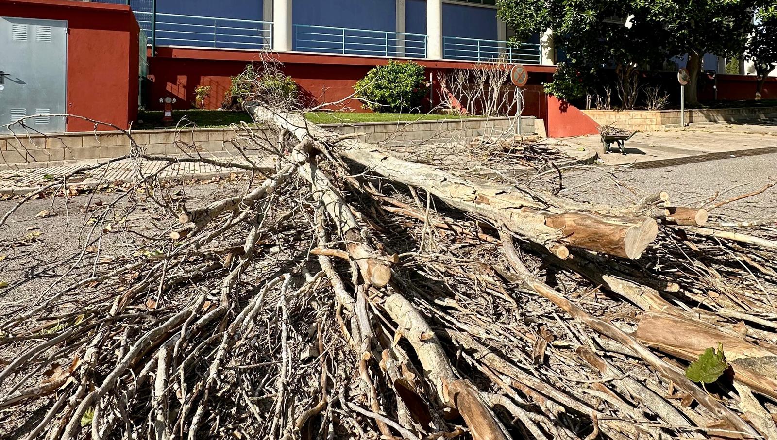 Detalle del árbol derribado junto al Polideportivo Sa Blanca Dona y las instalaciones de Es Raspallar. Fotos Noudiari.es