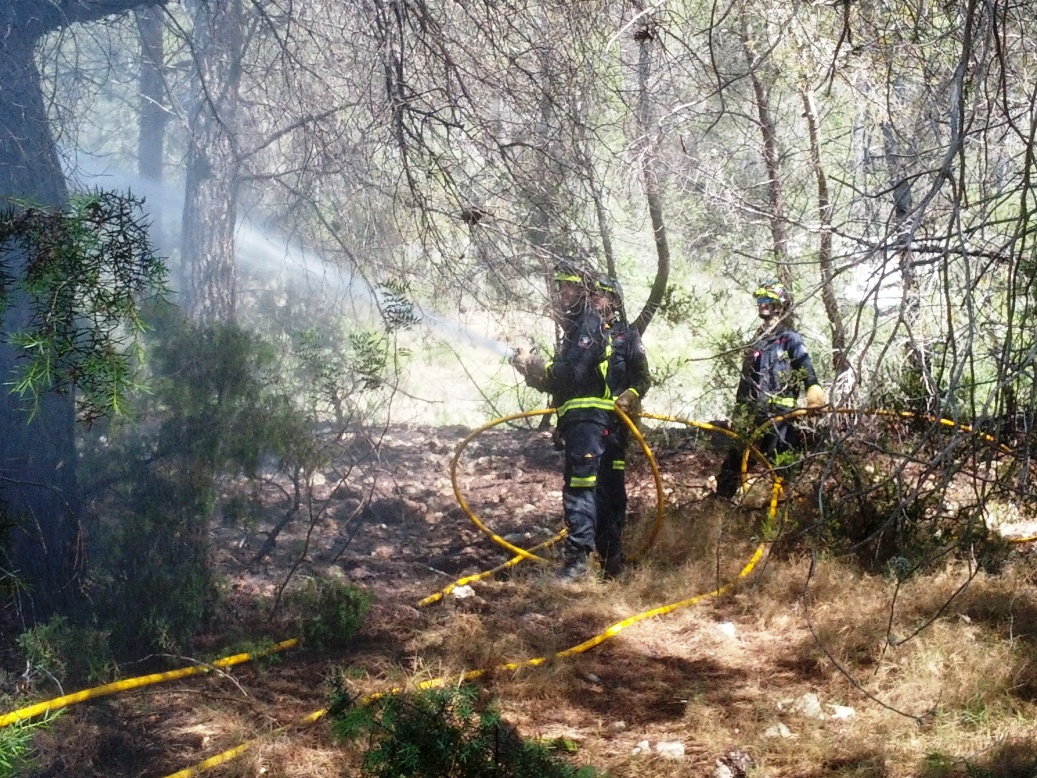 @V. R. / Los bomberos y medios terrestres y aéreos del Ibanat han controlado un incendio forestal que se produjo a primera hora de la tarde en Ses Salines, concretamente en el Puig de Can Mates, una zona de difícil acceso y que hizo saltar todas las alarmas.