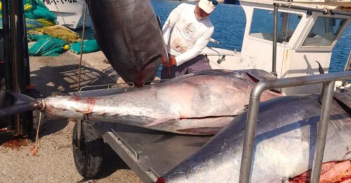 Gerardo y Vicent Pagès, patrón del llaüt ‘Es Vedrà’, la Cofradía de Pescadores de Ibiza, capturaron el pasado viernes tres ejemplares de atún rojo de gran tamaño, como se aprecia en las imágenes que acompañan en estas líneas. Según explica Peix Nostrum, hay pocas especies que sean tan codiciadas como el atún rojo. Este extraordinario animal, capaz de alcanzar dimensiones y pesos espectaculares -hasta 3 metros de largo y 700 kg de peso- surca las aguas pitiusas cada año en sus rutas migratorias, que lo conducen desde el atlántico a las cálidas aguas mediterráneas para su reproducción.