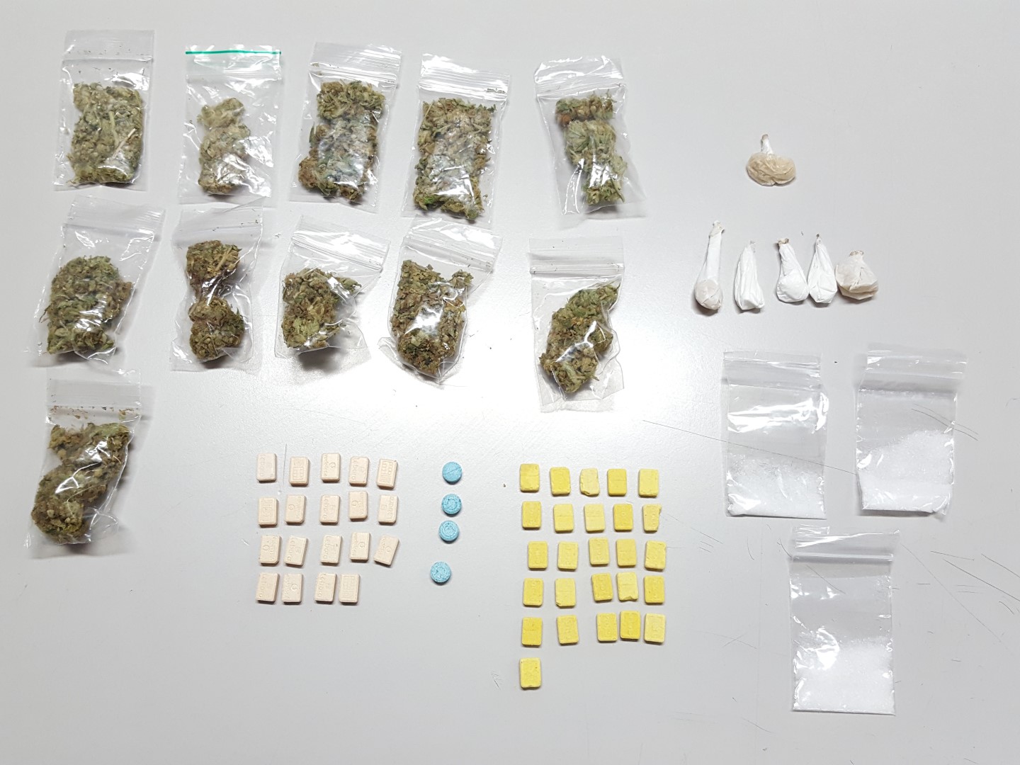 La Policía Local de Sant Antoni dirigió el operativo, que contó con la ayuda del perro «especialmente adiestrado para esta tarea», y que se saldó con un detenido y la incautación de 11 bolsitas de marihuana, 49 pastillas de éxtasis, 6 papelinas y 3 bolsitas de otro tipo de sustancia estupefaciente.