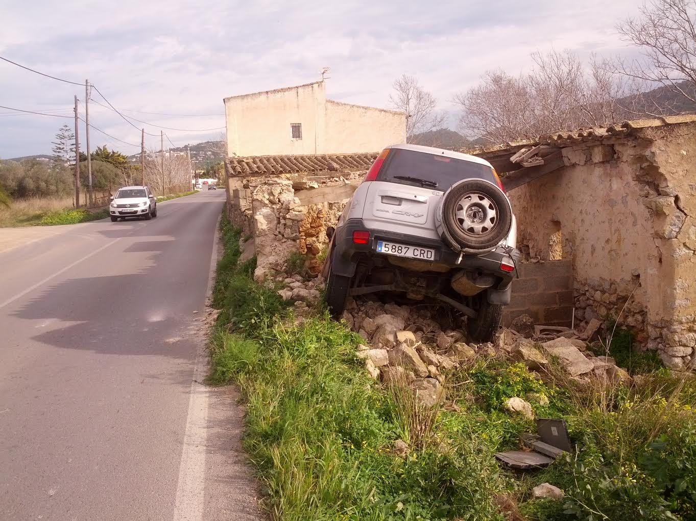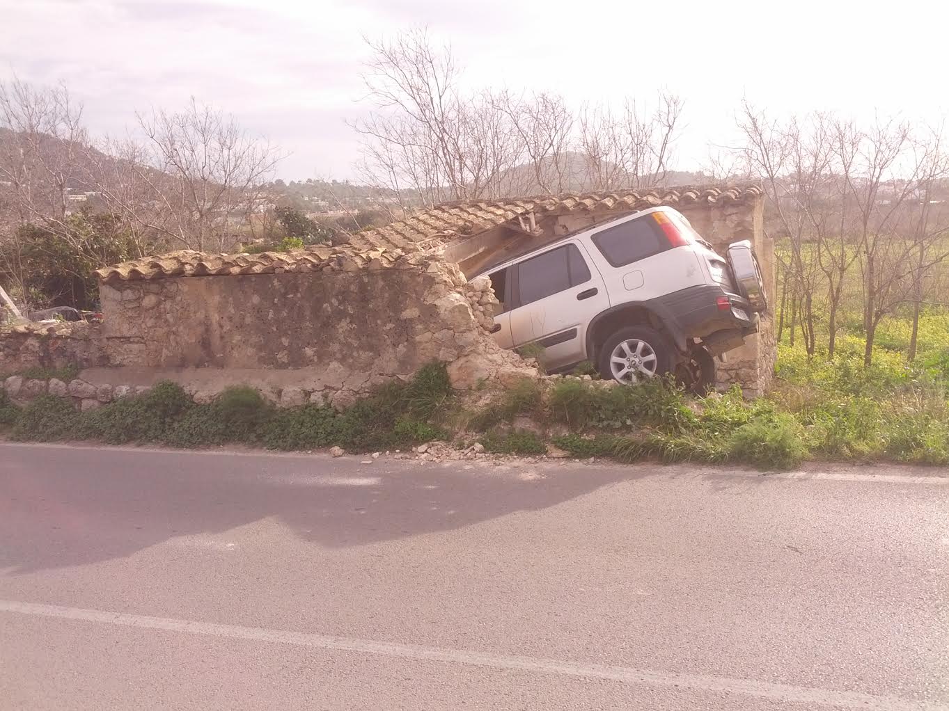 @Noudiari/ Un todoterreno se ha empotrado en la noche del viernes al sábado contra una edificación parcialmente derruida que se encuentra en el arcén de la carretera de Jesús. El vehículo, un Honda CR-V con matrícula española, ha quedado atrapado entre las ruinas tras impactar frontalmente contra esta construcción mientras circulaba en dirección a Jesús procedente de la carretera Santa Eulària. No es la primera vez que un vehículo se sale de la carretera en esta curva, ya que hace años un autobús sufrió un accidente de características similares en este mismo punto de la red viaria de Eivissa.