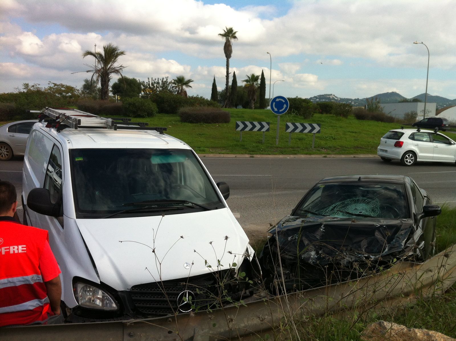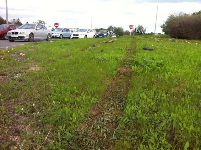 @Pablo Sierra del Sol / Una conductora de 31 años ha perdido el control de su automóvil, un Peugeot 206 cc, a pocos metros de entrar en la rotonda de acceso a Can Negre, mientras conducía en dirección a Eivissa. El vehículo ha impactado contra la señalización de la glorieta, y atravesó la misma, recorriendo una quincena de metros por el centro de la rotonda. En esa zona ajardinada se puede observar el surco de las ruedas y las piezas desprendidas de los bajos del coche. Al parecer, la accidentada se habría sentido mareada metros antes de la colisión.