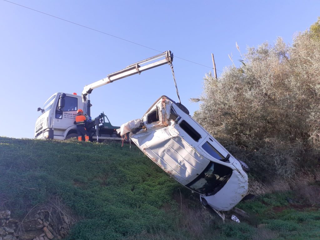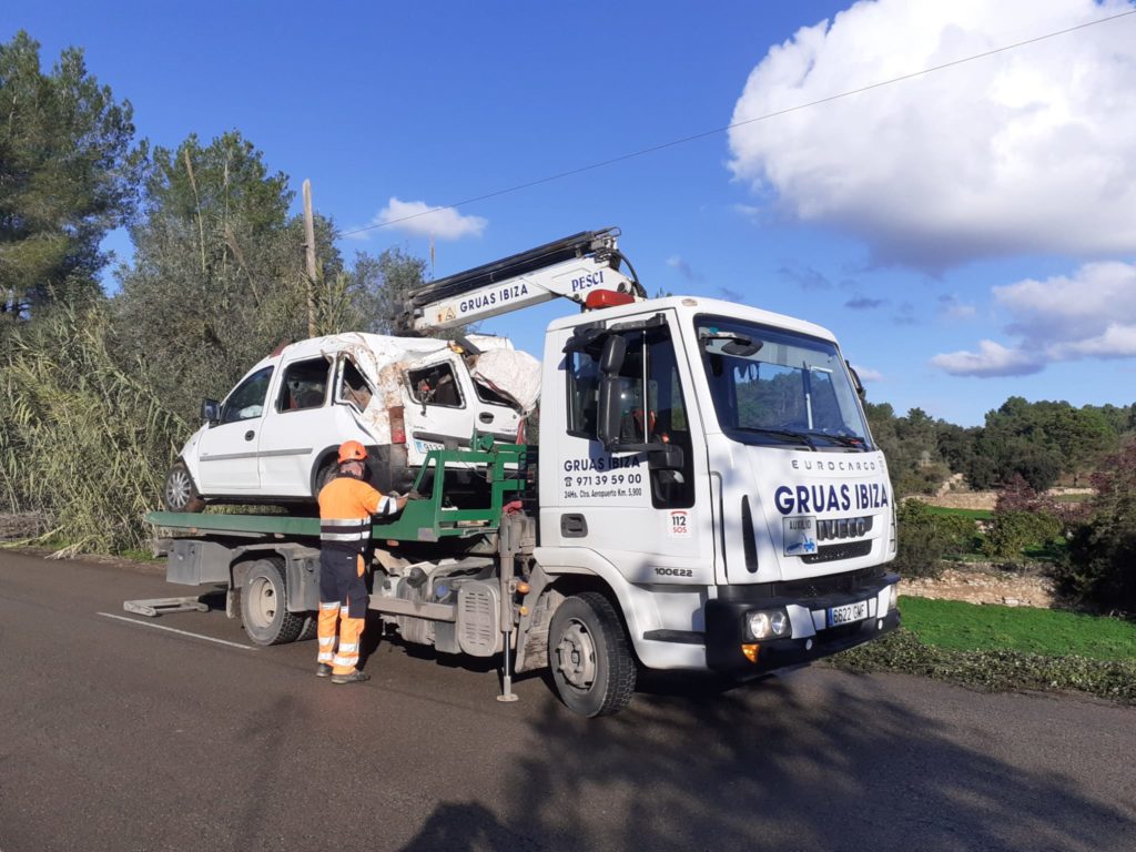 Dos equipos de auxilio en carretera de Grúas Ibiza han sido los encargados de recuperar el vehículo con grúas plumas.