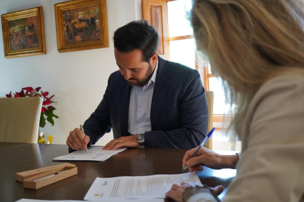 Vicent Guasch en el Ayuntamiento junto a Carmen Ferrer, firmando un acuerdo de colaboración.