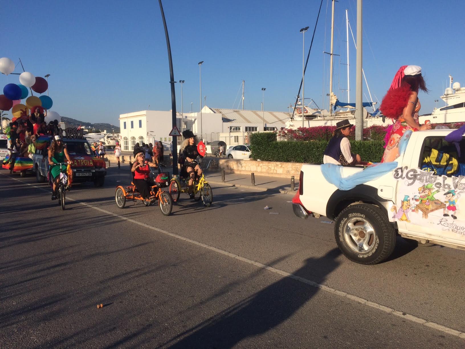 El centenar de participantes han discurrido por la Avinguda de Santa Eulària para finalizar en el puerto de Vila, junto a la estatua del pescador. Aunque el primer tramo, la marcha ha estado un tanto desangelada- a pesar de la música atronadora que salía de los vehículos-, la animación ha ido in crescendo así como se aproximaban a la entrada del municipio de Vila, donde eran recibidos por numerosos residentes y turistas curiosos, que no han dudado en aplaudir, silbar y bailar.