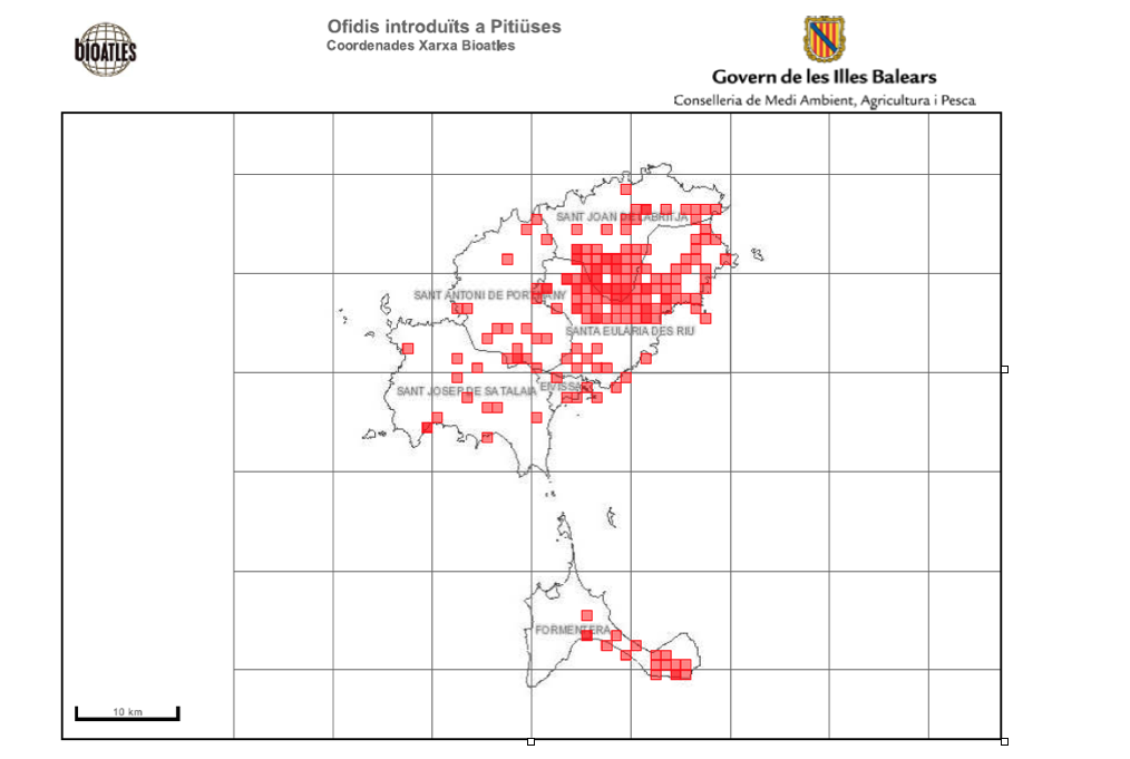 Aunque se desconoce qué población actual hay de serpientes en las islas, el mapa de distribución- realizado a través de los avisos y capturas por parte de particulares- la zona de Santa Eulària, Sant Carles y Sant Llorenç se convierten en los ‘puntos calientes’.
