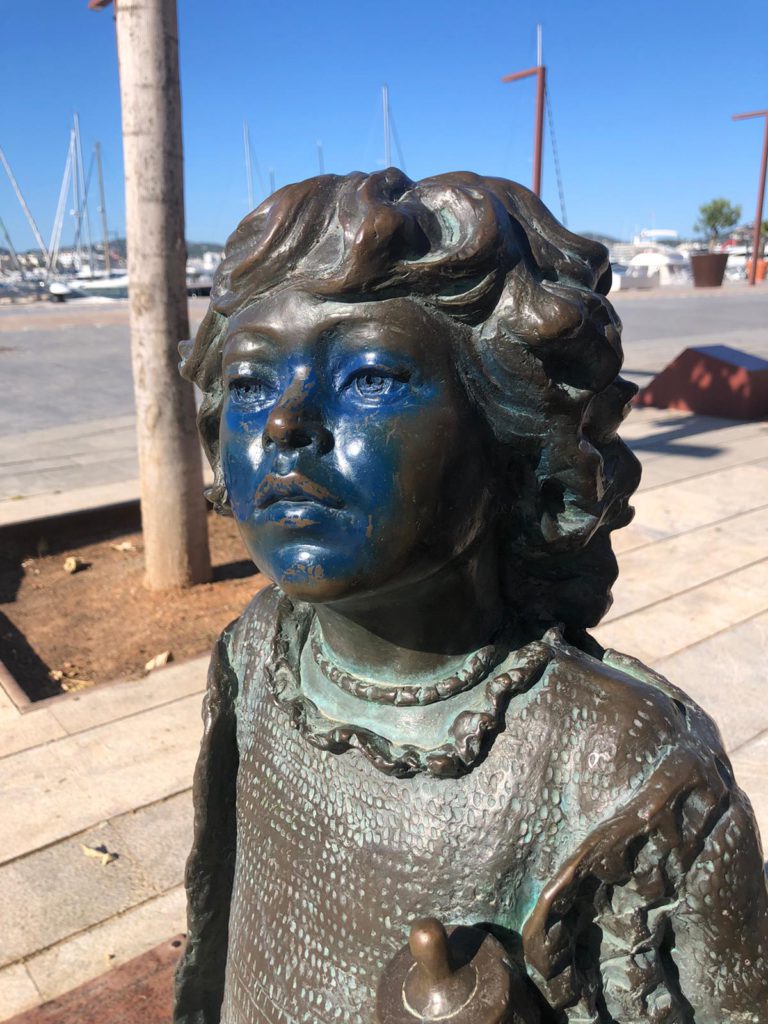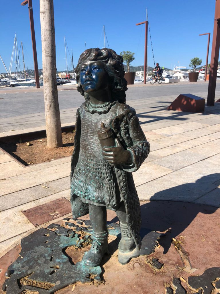 Hace pocos días, otra imagen del mismo monumento, más amable, constituía una buena metáfora de la situación de Ibiza durante la pandemia del Covid-19, con la niña y el hombre luciendo mascarillas.