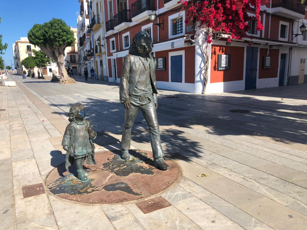 Esta escultura en bronce es una obra de la escultora Ció Abellí y está basada en una famosa imagen que el fotógrafo Toni Riera tomó en 1972 en Amsterdam, pero que siempre se ha vinculado a la isla, donde ha ilustrado carteles de fiestas como la Flower Power de Pachá. La escultura fue pagada y donada a la ciudad precisamente por el fundador de Pachá, Ricardo Urgell, y luce en su ubicación desde 2016.