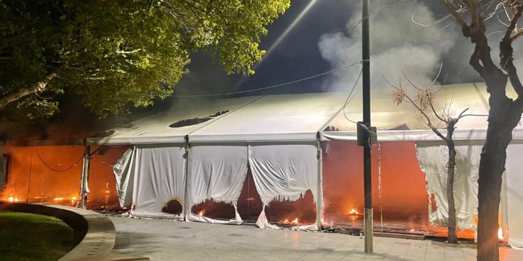 La carpa dispuesta sobre el Passeig de ses Fonts de Sant Antoni ha sido devorada por las llamas poco antes de las diez de la noche de hoy. Las causas que han provocado el incendio se desconocen en este momento, aunque se baraja la posibilidad de que se haya originado como consecuencia de un fallo eléctrico. La instalación ha sufrido importantes daños, como se aprecia en la imagen y los vídeo que acompañan estas líneas.
