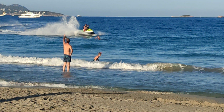 La convivencia entre las motos de agua y los bañistas no siempre ha sido pacífica. Sin embargo, ante un incidente, quien tiene todas las de perder es el bañista, desprovisto de motor y carrocería. Y algo así es lo que temieron las personas que se encontraban ayer a las siete y media de la tarde en Platja d’en Bossa, tal y como explican a Noudiari. Dos motos estuvieron circulando muy cerca de los bañistas que en ese momento se encontraban en el mar, con una de ellas pasando a pocos metros de una persona que se dirigía nadando hacia la orilla. Al parecer, no se respetaban las zonas delimitadas para esta actividad privada en la playa, para preocupación de los turistas y residentes que se encontraban en la zona en ese momento. Las peripecias de las motos de agua duraron aproximadamente 10 minutos, señalan a este medio. En el vídeo que acompaña a estas líneas se puede ver como reprochan a los «pilotos» su conducta al pasar tan cerca de un nadador; desde la moto algo parece responder, no se distingue si es una disculpa o un desprecio.