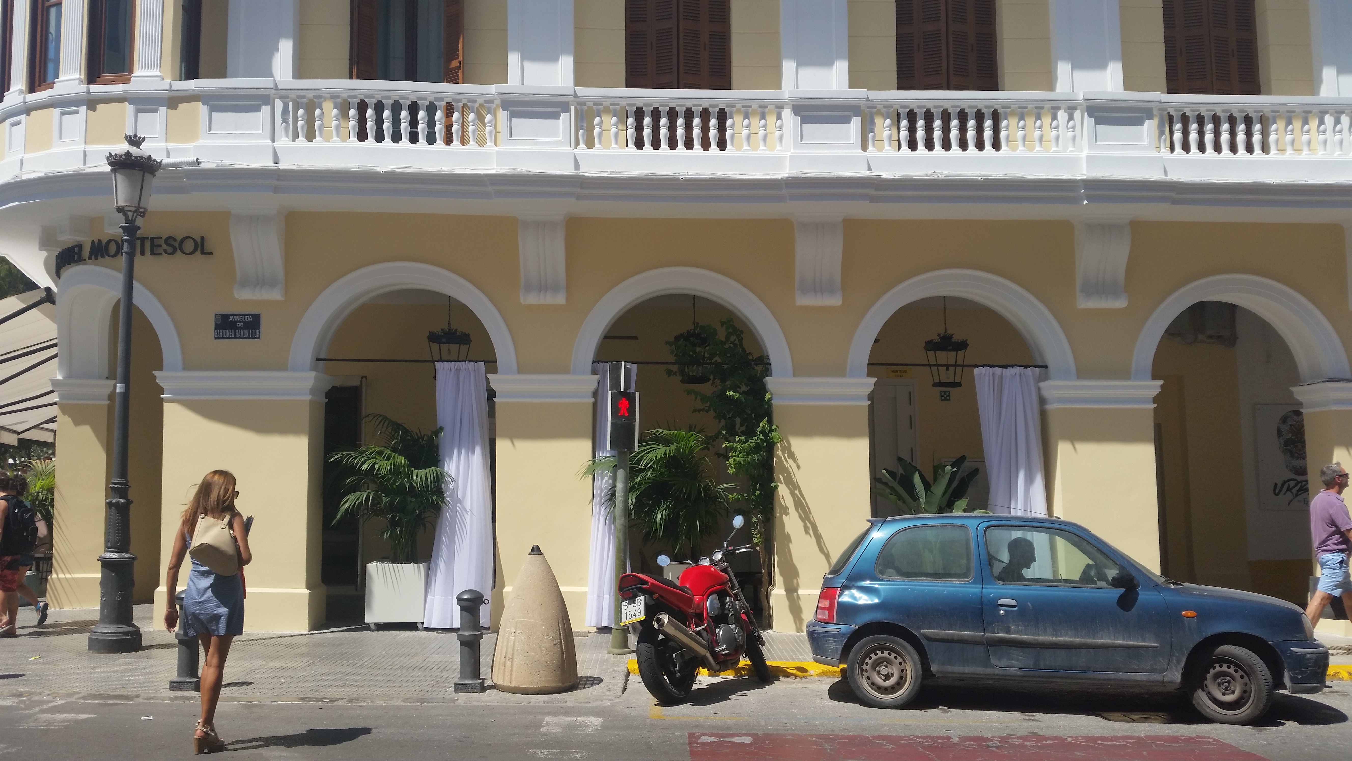 @Noudiari/El Ayuntamiento de Ibiza está estudiando la legalidad del cierre de los arcos del Gran Hotel Montesol con cortinas y con grandes macetas, que impiden el paso de los viandantes por debajo de la arcada como era tradicional.